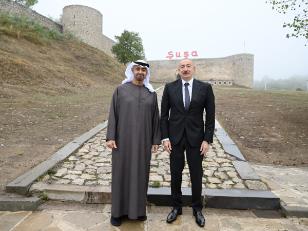 Azərbaycanın və Birləşmiş Ərəb Əmirliklərinin prezidentləri Şuşa qalasının önündə foto çəkdiriblər