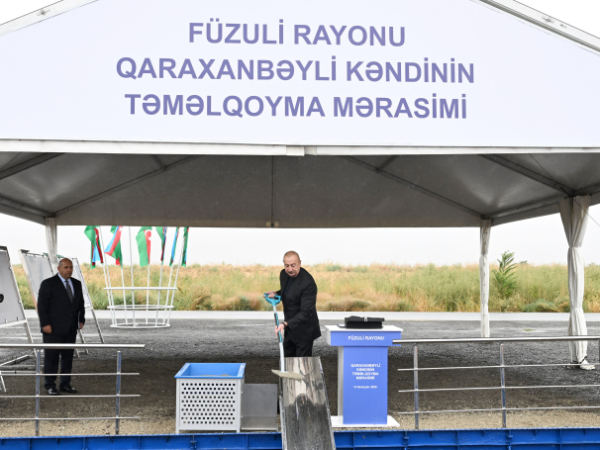 Prezident İlham Əliyev Füzuli rayonunun yeni salınacaq Qaraxanbəyli kəndinin təməlini qoyub