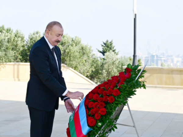 Dövlətimizin başçısı “Əbədi məşəl” abidəsinin önünə əklil qoydu.